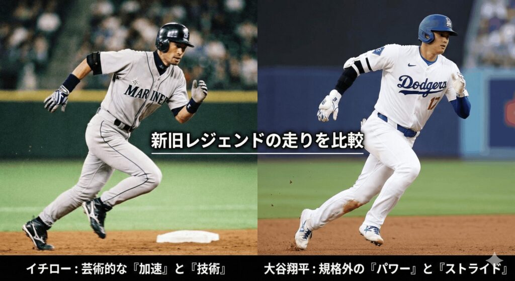 よく比較されるのが、日本が誇るレジェンド、イチローさんとの違いです。イチローさんの走りは「忍者」のようにしなやかで、初速からトップスピードまで一切の無駄がない、極めて洗練されたものでした。