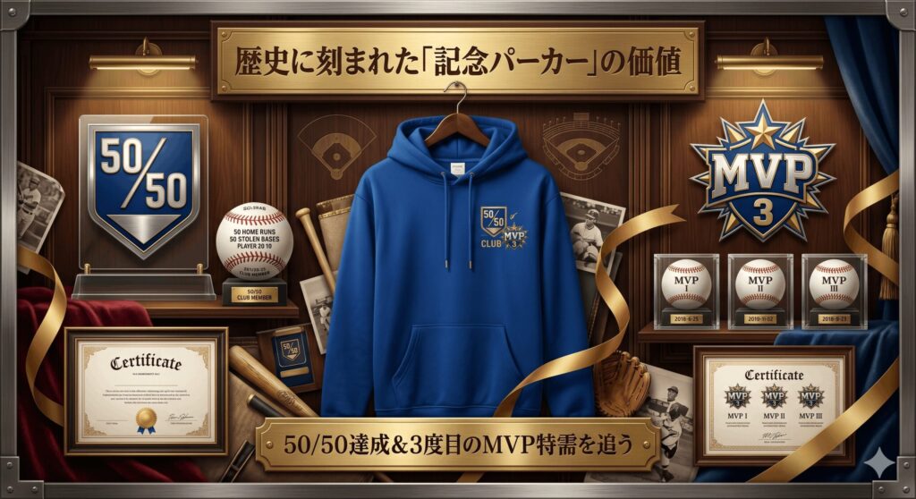 大谷選手が成し遂げた「50本塁打・50盗塁」という前人未到の偉業や、3度目のMVP獲得。これらの歴史的瞬間を記念したパーカーは、アパレル市場においてもはや「通貨」のような価値を持ち始めています。発売直後に完売するのは当たり前で、二次流通市場では定価の数倍で取引されることも珍しくありません。