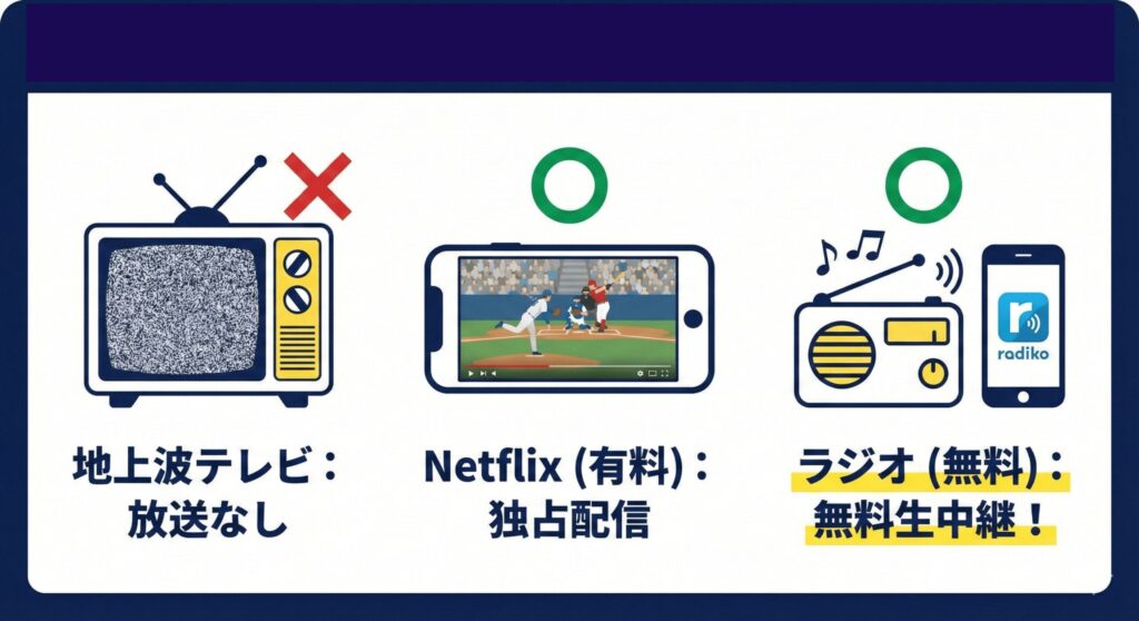 なぜここまで極端なことになったのか。それは、Netflixが日本国内における「放送権」と「配信権」の両方をパッケージとして独占獲得したからです。テレビ局側も獲得に動いたようですが、跳ね上がった放映権料の壁は高く、グローバル企業の資本力には太刀打ちできなかったという側面があるみたいですね。野球が「誰もが無料でテレビで見られるもの」から「特定のプラットフォームで楽しむ有料コンテンツ」へと完全にシフトした象徴的な出来事と言えます。