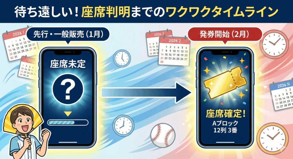 WBCのチケットは、手に入れたルートによって「座席が判明するタイミング」がバラバラなんです。まずは、あなたがどのフェーズでチケットを確保した(または確保する予定)かに合わせて、いつ詳細がわかるのかを整理していきましょう。このタイムラインを知っておくだけで、無駄な不安は解消されますよ。