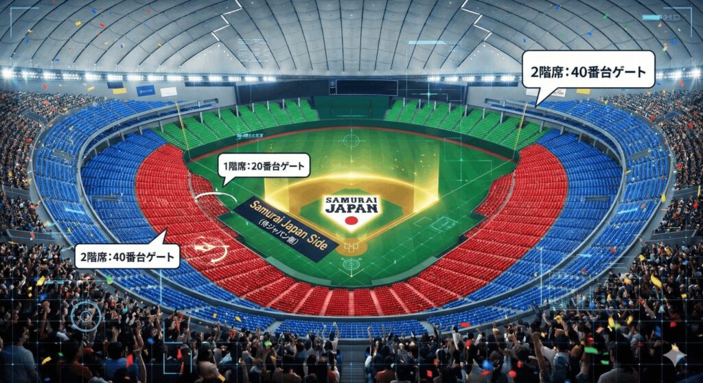 チケットを発券して座席番号がわかった後、次に気になるのは「その席からグラウンドがどう見えるか」ですよね。ここでは、WBCの主な舞台となる東京ドームと京セラドーム大阪の構造をもとに、お手元のチケットが持つ意味を読み解いていきましょう。ゲート番号やサイドの指定は、当日の満足度を大きく左右します。
