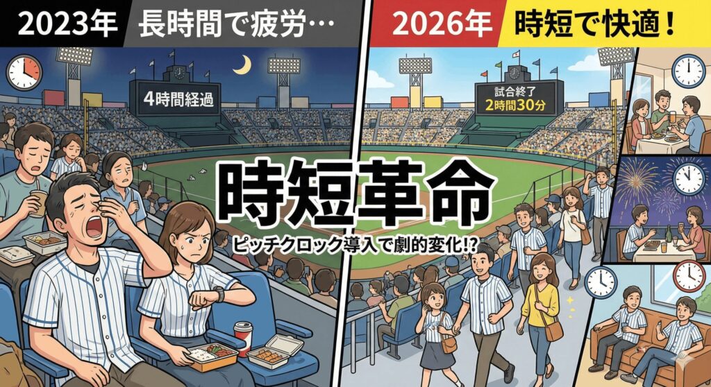 2026年大会で最も注目されているのが、ピッチクロックの正式導入です。MLB主催の大会である以上、世界基準に合わせる動きはほぼ確実視されています。もし導入されれば、試合時間は今の3時間11分から、2時間40分〜50分程度へと一気に短縮されるはずです。
