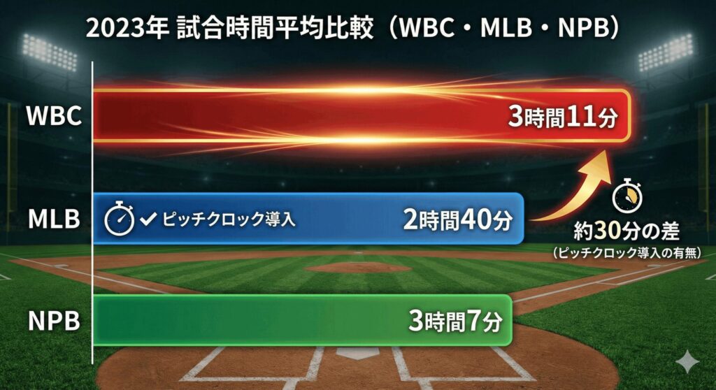 ここまで解説してきた通り、WBCの平均試合時間は約3時間11分という結果でした。球数制限やピッチクロックの不在といった国際大会特有の要因が、MLBやNPBとは異なるリズムを生み出しているんですね。
