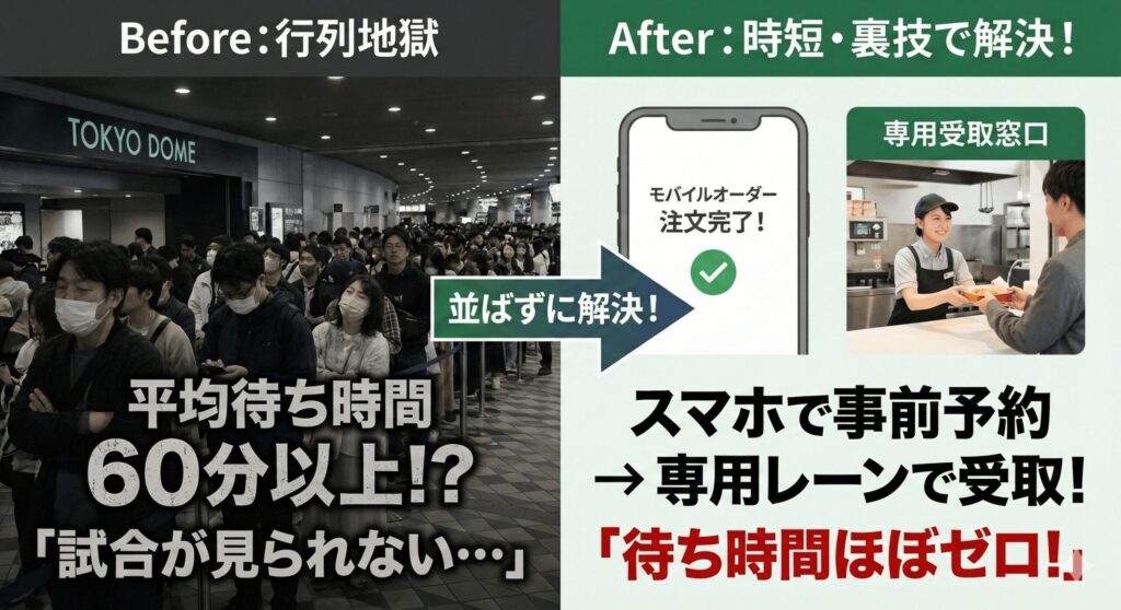 せっかくの侍ジャパンの試合、行列に並んでいてチャンスシーンを見逃すなんて、一番避けたいですよね。そこで活用したいのが、東京ドーム独自のモバイルオーダーシステム「グルモバ」や「GIANTS APP」です。自分のスマホから自席にいながら注文ができるので、物理的な行列に並ぶ必要がなくなります。