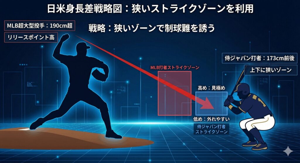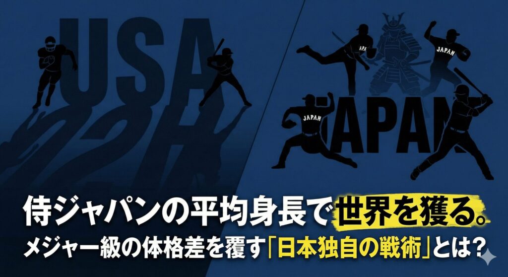 アメリカ代表やドミニカ代表といったメジャー軍団と戦う際、どうしても避けられないのが「平均身長の差」です。MLB投手の平均は約189cmもあり、日本より約9cmも高いのが現実。しかし、日本はこの差を逆手に取った戦い方をしています。